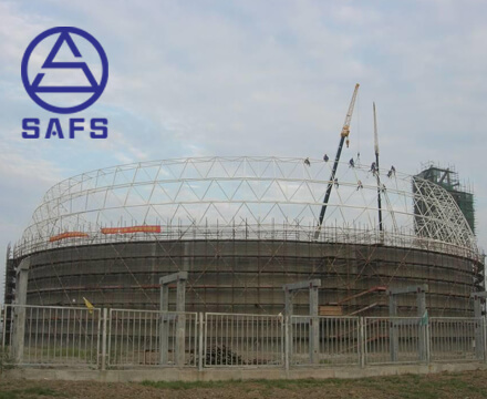 - Transport the assembled unit block to the ground near the location to be installed in the storage. Each hoisting unit block weighs about 200kg. The installation of the unit block of this project is planned to be hoisted with a 1ton electric hoist and fixed pulley according to the site conditions. Before hoisting, transport the unit block to be hoisted to the ground below the hoisting position. Hang the upper hoisting pulley on the member above the hoisting position through the sling. The hoist lifts the unit block through the fixed pulley and the upper pulley fixed firmly on the ground. Carry out a trial hoisting before lifting to ensure that the hanging parts are balanced before hoisting. After being lifted to the installation position, an installer shall be set up on each ball node corresponding to the installation position of the space frame catwalk, and respectively connect the high-strength bolts on the upper ends of the four suspenders of the unit block with the bolt balls and fasten them in place, then the hook can be released. One catwalk unit block is installed, and then the next unit block is installed in sequence.