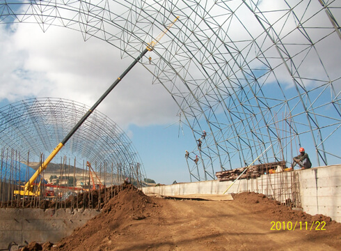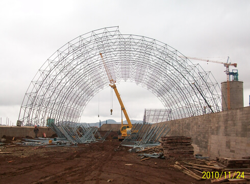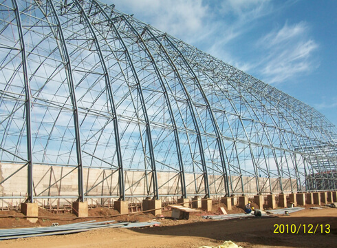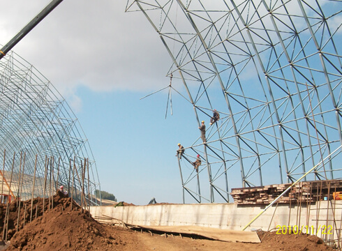 The project includes 5 projects: the barrel-shaped space frame storage of the raw coal pre-homogenization field, the length is 270m, the span is 48m, and the height of the space frame is 19.963m; the gypsum and mixed material storage shed is a flat space frame with a length of 150m. The span is 42m, and the vector height of the space frame is 1.8m; the barrel space frame storage of the limestone pre-homogenization field is 505m long, 57m span and 26.6m space frame height; the barrel space frame for auxiliary raw materials stores materials pre-homogenized piles The length is 270m, the span is 49.4m, the height of the space frame is 25.7m; the conical space frame storage of clinker has a diameter of 60-15m, the height of the space frame is 17m, and the thickness of the space frame is 2m.