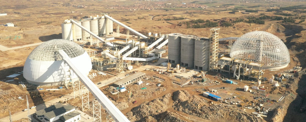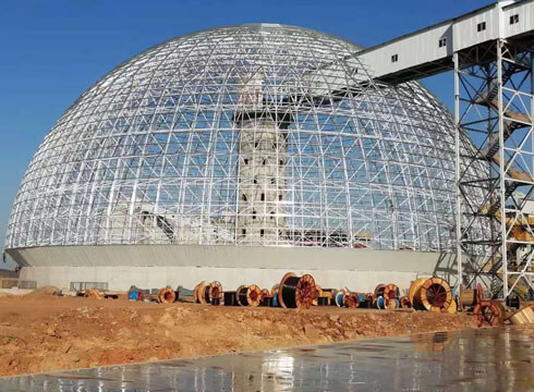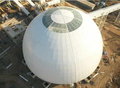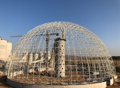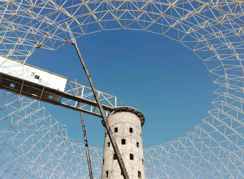 The structure of the lattice is a quadrangle cone spherical shell with bolt-ball joints. Below the elevation of 3.4 m is the reinforced concrete coal retaining wall, and the height of the grid is 40.5 m.