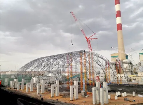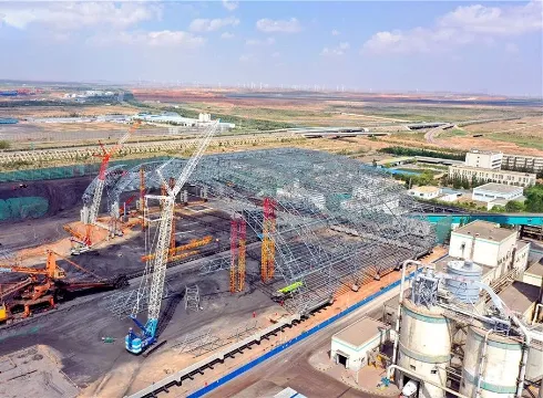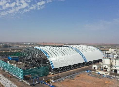 The main structure of the fully enclosed coal shed of Qingtongxia Aluminum Power Generation Co., Ltd. coal yard is a prestressed tube truss. Adopt a large-span prestressed pipe truss structure,The form of the truss is a spatial triangular tube truss with a length of 298m and a maximum span of 145m.The total enclosed building area is 31780㎡, and the total weight of the main truss steel structure is 2,100 tons.