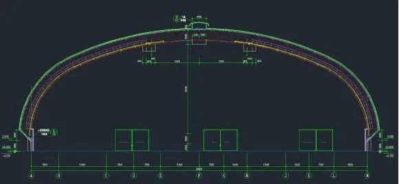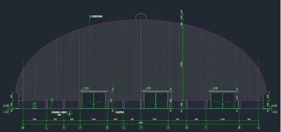 The project’s space frame employs a right-angled tetrahedral grid structure with bolted spherical nodes, forming an elliptical parabolic shell. Structural members utilise thin-walled tubular sections. The span measures 95m (exceeding 60m, qualifying as a hazardous major project), with a longitudinal length of 100m. The entire structure weighs 486 tonnes, employing a lower chord support configuration with a maximum height of 34.20m at its apex. The building incorporates natural ventilation turrets at the roof level, with the roof and end-wall cladding comprising aluminised galvanised profiled steel sheets in an exposed purlin configuration. As illustrated below:
