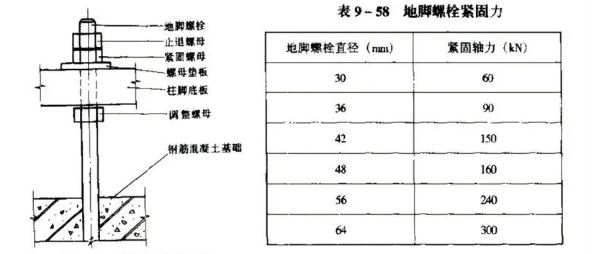 The data in the table provides a simple comparison with the preload force of high-strength bolts. For an M30 diameter, Grade 8.8 high-strength bolt, the tightening axial force is 310 kN (preload force). Thus, the requirements for anchor bolts are equivalent to 20% of those for high-strength bolts.