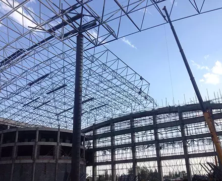 The steel space frame is installed using the high-altitude assembly method. First, assembly supports are erected at the designated locations. Then, with the help of a crane, space frame components are hoisted in sections (or blocks) to their designated positions in the air, where they are assembled on the supports.