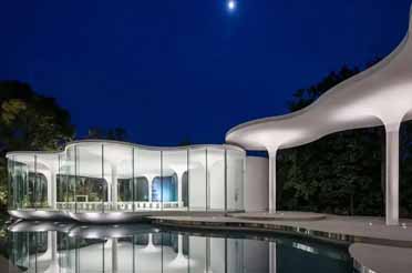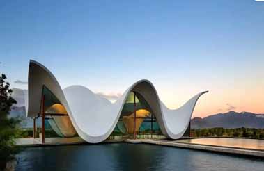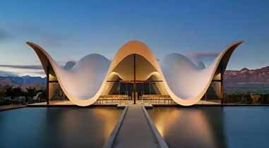 This captivatingly elegant chapel, nestled on the picturesque Bosjes Farm outside Cape Town, stands as a masterpiece of modern architecture—a harmonious symphony of design. Its silhouette echoes the surrounding mountains, while its undulating canopy harmonizes with the landscape. Pools and translucent glass surfaces create a sense of weightlessness, allowing the structure to seem to float effortlessly, seamlessly merging into the vistas of the green valley and distant peaks. Its gracefully undulating white wave-like exterior presents a perfectly symmetrical and balanced composition, along with a soothing, sinuous optical effect, as if the wings of God were floating in the valley.