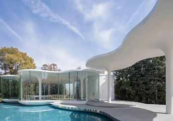Japan’s newly constructed “Cloud of Luster” Chapel replaces the former “White Wing” Chapel as part of the La-Vienna Wedding Hall complex, serving as a sacred space to commemorate life’s most significant days. The chapel’s entirely transparent structure opens boundlessly toward the front garden, water features, and expansive greenery. Its gentle curves and translucent glass evoke the image of light clouds dwelling within nature, enveloping dreamlike light and shadow. The chapel’s white is pure and resplendent, radiant and luminous. Double-curved circular pillars descend from the minimalist ceiling, connecting vertically with the monochrome floor—evoking the appearance of natural white stalactites.