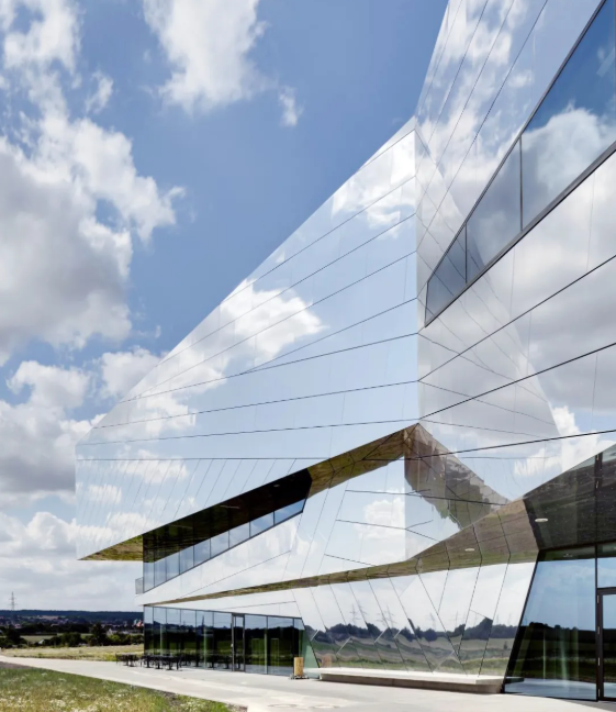 The new façade material is striking: vertically arranged mirrored aluminum composite panels whose surfaces reflect the surrounding environment like mirrors. The architects used it to create a contrast with the rough concrete façade, making the forest and sky, light and shadow, and the passage of time and seasons all part of the façade.