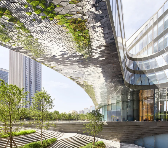 The podium facade features a monumental curtain wall composed of shimmering silver aluminum composite panels formed into overlapping scales. This dynamic surface transforms under varying light conditions, creating an artistic silhouette that filters the surrounding landscape with boundless vitality. Together, these elements articulate a superlative aesthetic presence for Raffles City Hangzhou—one that radiates consistent beauty from within and without.
