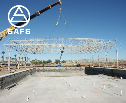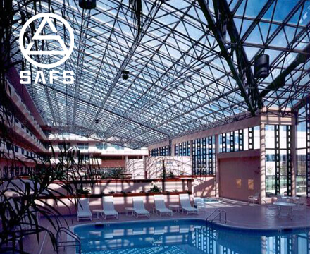 A space frame is a structure system assembled of linear elements so arranged that forces are transferred in a three-dimensional manner. Space frame frequently provides the right answer and satisfy the requirements for lightness, economy and speedy construction.